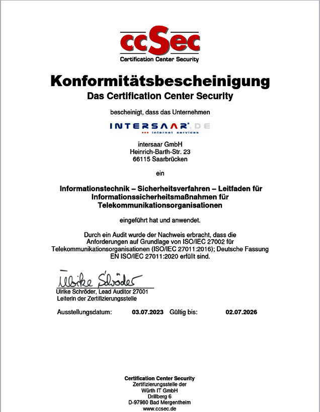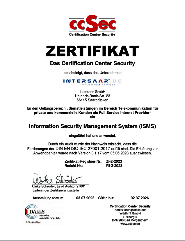Die intersaar GmbH hat ein Informationssicherheitsmanagementsystem (ISMS) etabliert.